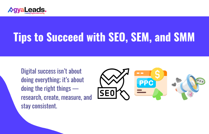 - Be consistent: SEO takes time, SMM needs frequent posting, and SEM needs regular optimization.